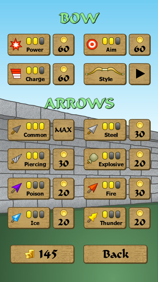 Burn, freeze, poison, eletrocute, explode or pierce the enemies with 8 types of arrows.